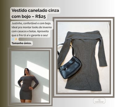 Descubra o charme do nosso vestido canelado cinza com bojo, uma peça essencial para o inverno! Com modelagem justinha que valoriza suas curvas, ele oferece conforto e elegância em qualquer ocasião. Combine com casacos e botas para um look quentinho e sofisticado nos dias frios. Tamanho único
